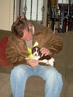 This cute faced dog was given to Carter the day after he got home from Africa by my cute mother dearest! Yes, his name is really TANK!!! I talked Carter into naming him this to spare one of our children from inheriting the treterous name!! (NO lie, Carter really liked the name Tank.) Lucky for me, I'm so sly and tricked him into naming his new dog Tank before he could even realize what he was doing! :) I'm not going to lie, he was so DANG cute as a puppy! (He still is cute, but puppies are just so sweet.) My mom picked him up a few hours before Carter came over to see my family and the poor puppy was shaking and nervous so I put him in my shirt and he would just calm right down!! (We bonded right from the start :)